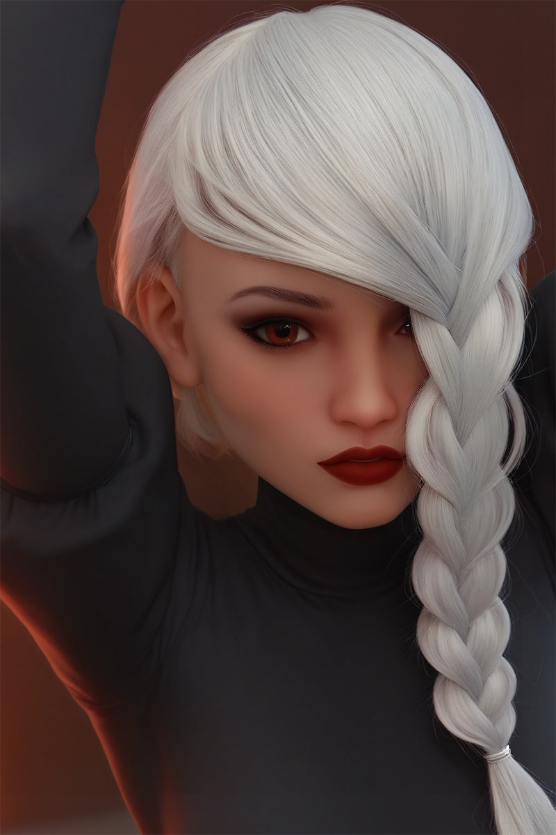 Carmen is a high-end sex doll that embodies both strength and seductive appeal, inspired by a fierce female warrior. She features striking white hair styled in two delicate braids, one of which gracefully falls in front of her, adding a mysterious and elegant touch. Her sleek black bodysuit emphasizes her confidence and poise, showcasing clean lines and a refined silhouette. Carmen is the perfect fusion of power and beauty, leaving a lasting impression with her stunning appearance.